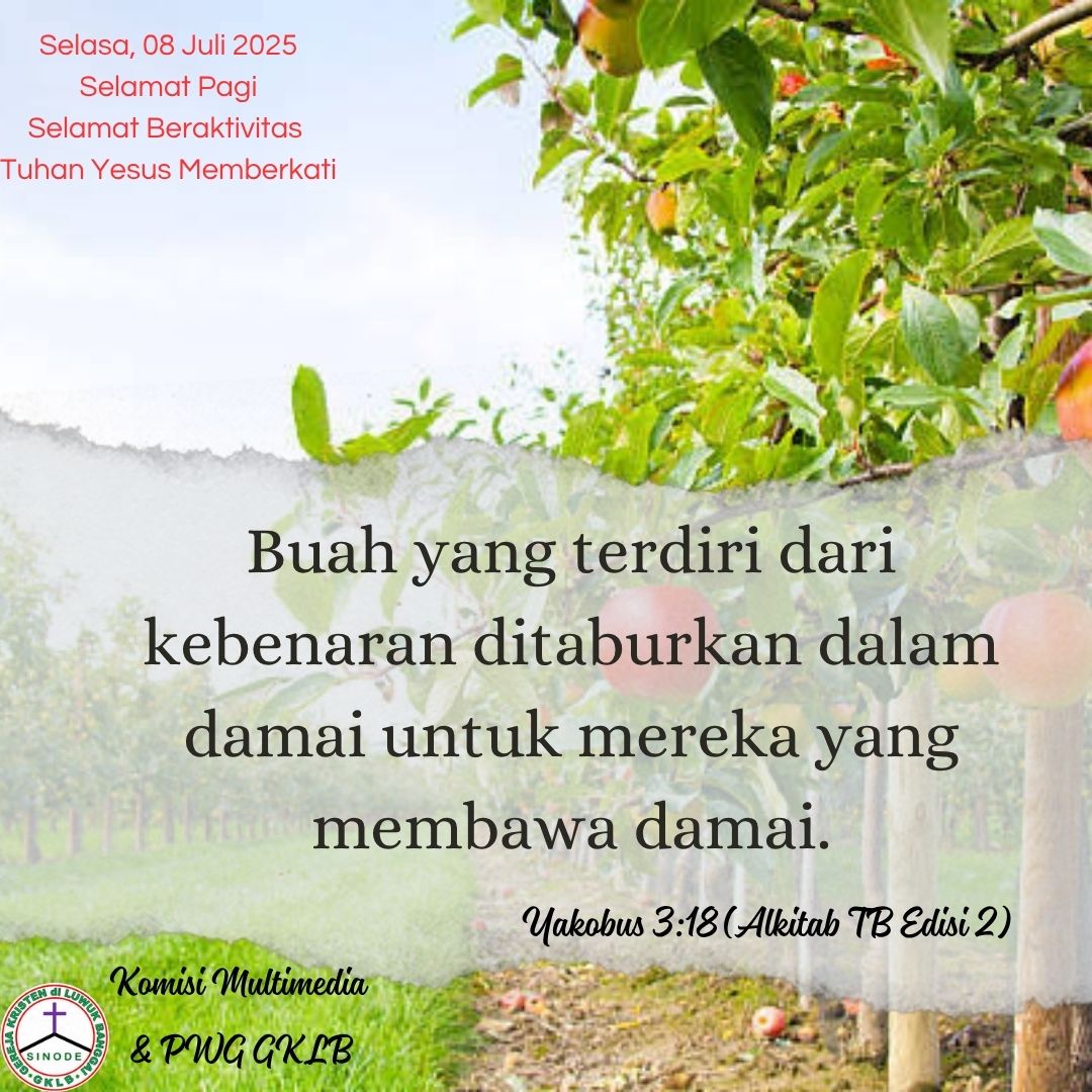 Renungan harian Selasa, 8 Juli 2025 Pembacaan Firman Tuhan: Yakobus 3:18 Salam Sejahtera, Di tengah dunia yang penuh dengan konflik, persaingan, dan suara yang saling bersahutan untuk menang sendiri, kedamaian