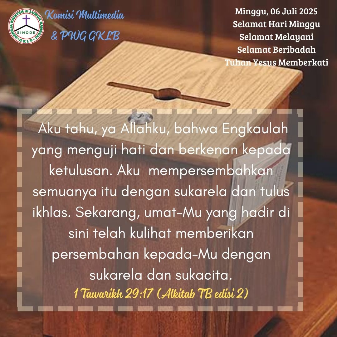 Khotbah Hari Minggu ( GKLB ) Minggu, 6 Juli 2025 Bahan Bacaaan : 1 Tawarikh 29:10-19 ( renungan ayat 17 ) Tema : Persembahan Yang Ikhlas dan Sukarela Shalom, •